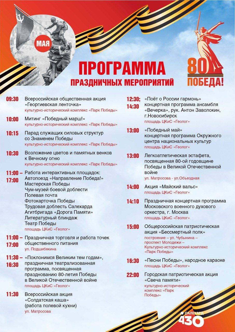 Приглашаем салехардцев и гостей города присоединиться к праздничным мероприятиям. Проведите этот день с близкими на праздничных мероприятиях окружной столицы, передавая эстафету памяти новым поколениям.