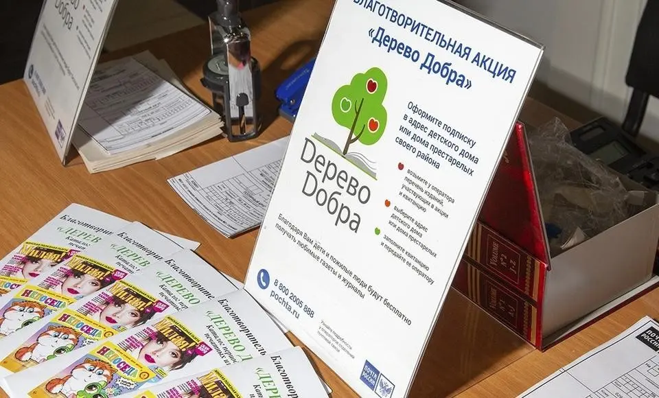 К благотворительной подписке «Дерево добра» может присоединиться каждый, у кого сердце открыто для благих дел. Такую возможность уже традиционно в течение нескольких лет предоставляет окружное управление Почты России, нужно просто заглянуть в любое почтовое отделение либо на сайт компании. А в этом году по инициативе главы региона «Дерево добра» ещё пышней распускает свою крону и корни – почтальоны для оформления подписки на издания делают шаги навстречу и придут по месту работы желающих поучаствовать в благотворительной программе. Заявку можно сделать по телефонам: 4-05-24 или 8-922-282-66-85.