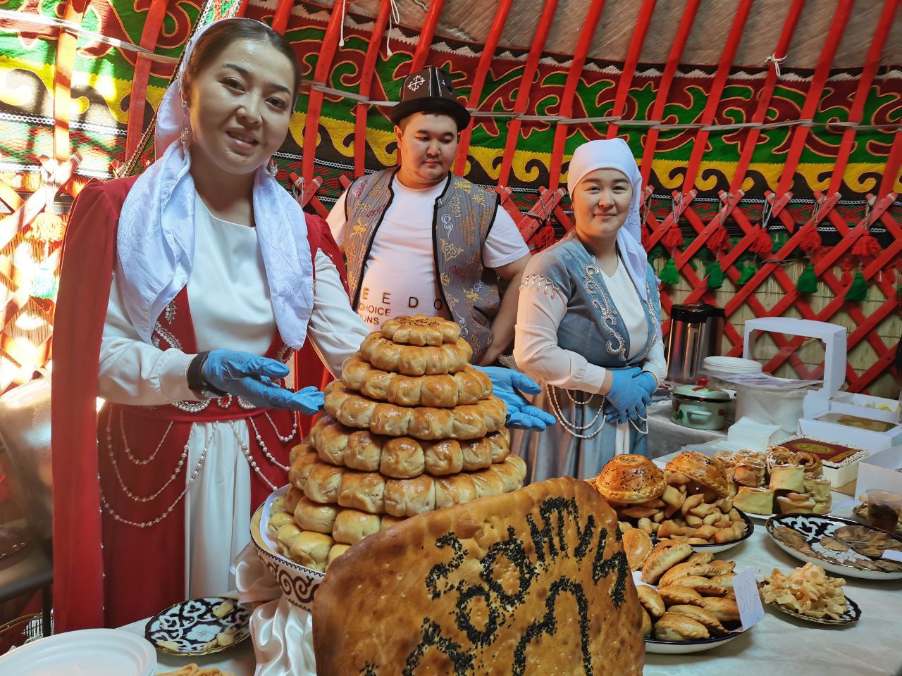 И здесь, внутри юрты, ждали горы угощений: напекли к празднику боорсоки, санзы, чучук, самсу, хлеб и лепёшки. Всегда радуют лучшей выпечкой мастерицы центра татарской культуры "Ватан". Их шаньги, хворост, ураму, чак-чак, пироги ждут и ищут на любом национальном празднике.
