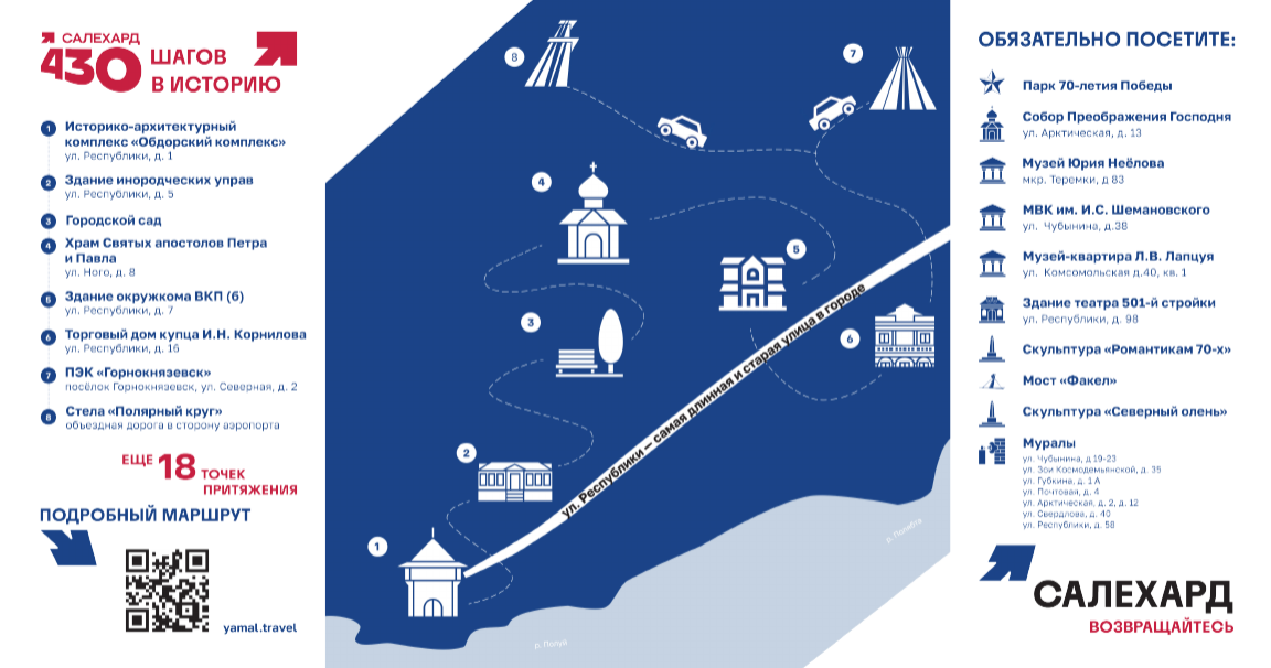 Столица Ямала отмечает 430-летие необычным пешим маршрутом. Жителям и гостям Салехарда предлагают пройти символические 430 шагов по центру города, совершив путешествие от древних истоков к современности. Маршрут объединяет восемь ключевых точек - от архитектурного комплекса «Обдорский острог» до стелы «Полярный круг».