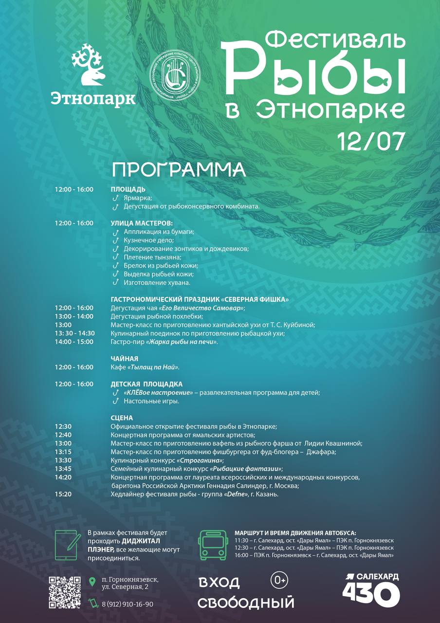 Рыбоконсервный Комбинат Салехарда готовит дегустацию рыбных консервов, а вот АТП города поможет всем добраться до места проведения фестиваля и обратно на специальном комфортабельном автобусе.
