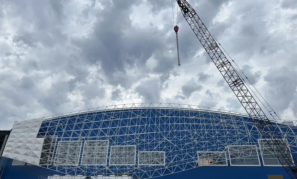 Его площадь – более 30 тысяч квадратных метров. Сейчас в здании ведется монтаж инженерных систем и отделочные работы. Часть помещений находится в чистовой отделке – здесь проводят окраску, укладывают плитку на полу и стенах. В помещениях игровой и тренировочной ледовых арен завершены бетонные работы и установлено технологическое оборудование для охлаждения льда. Чаша большого бассейна прошла гидроиспытание. Сейчас в помещении бассейна в завершающую стадию вступил монтаж системы вентиляции. На очереди облицовка чаши бассейна плиткой.