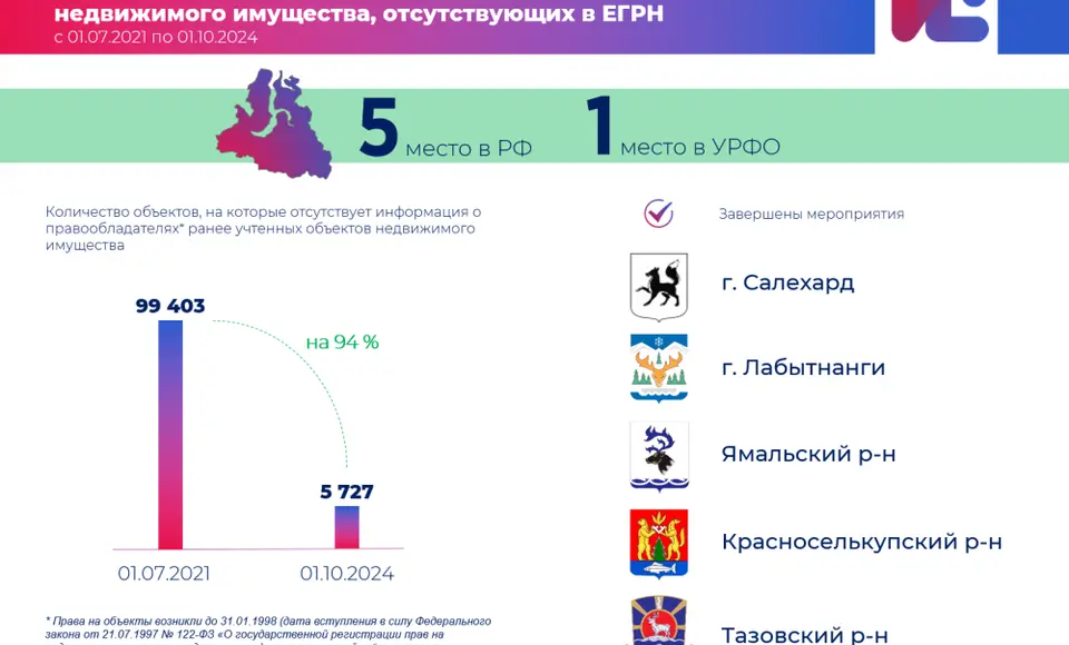 Ямал занял первое место в Уральском федеральном округе и вошел в топ-5 регионов России по работе с единым реестром недвижимости. Регион успешно обновил данные о правах собственности на недвижимость своих жителей, что позволило значительно повысить защиту их имущественных прав.